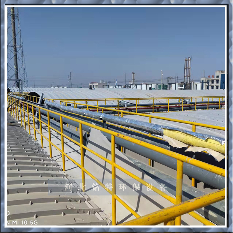 7、盖板的两侧设置有向内的导流板,高湿蒸发水份沿棚盖流入两侧的导流板后,经过表面的导流槽,再次流入污水池内,防止侵渍腐蚀池壁混凝土结构。